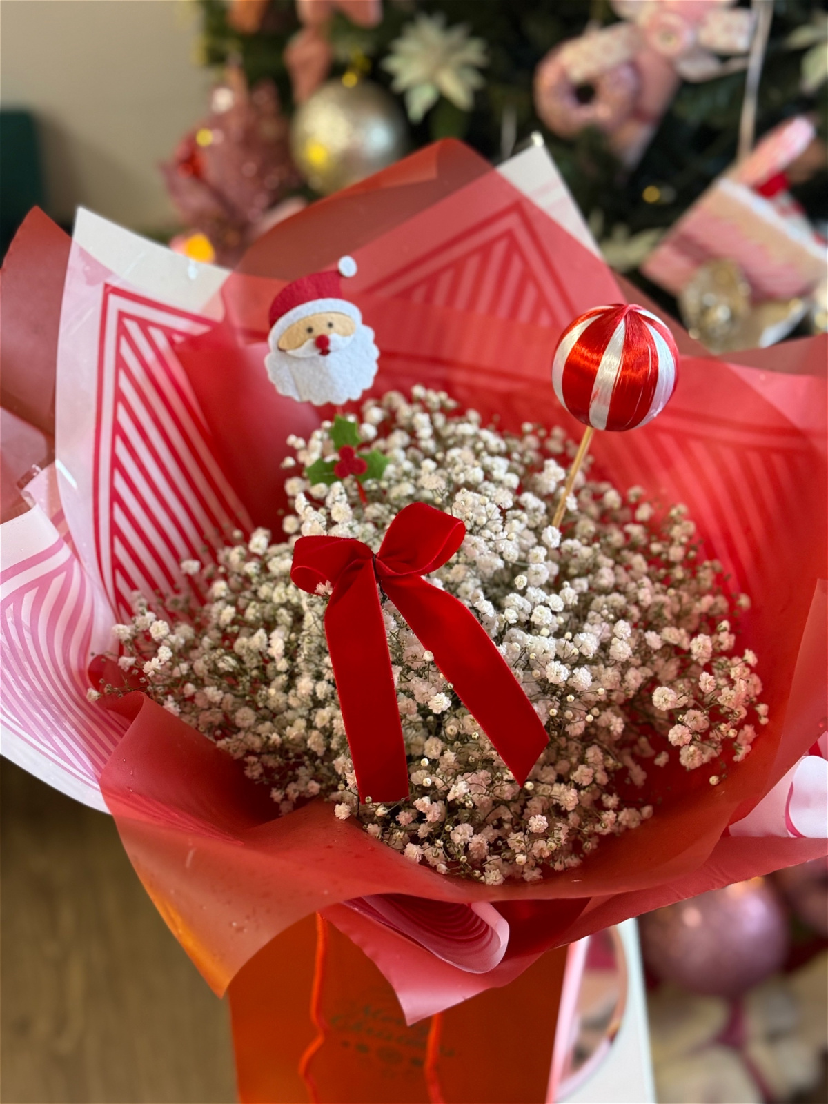 Bring festive magic to life with our Christmas Cloud Bouquet—a fluffy gypsophila arrangement wrapped in vibrant red candy cellophane. Finished with a charming Santa stick and a luxurious velvet bow, this bouquet adds the perfect touch of holiday cheer. Light, whimsical, and joyfully seasonal, it’s a beautiful gift or décor piece for Christmas celebrations.