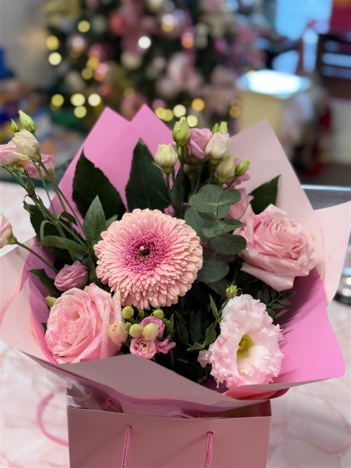 A striking Valentine’s Mixed Bouquet featuring classic red roses paired with a beautiful selection of seasonal flowers. Stylishly wrapped in black cellophane and presented in a Valentine’s gift bag, this arrangement is the perfect choice for a modern, romantic Valentine’s Day gesture.