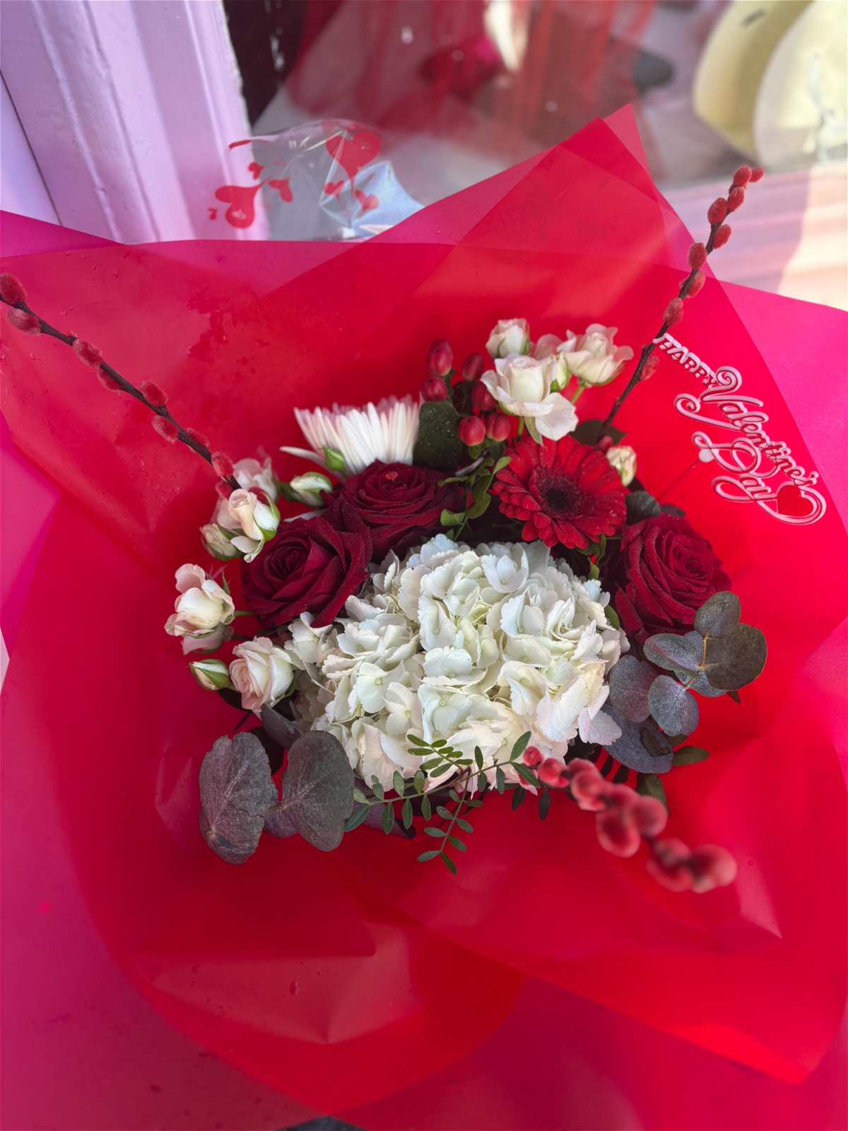Indulge in the elegance of modern romance with this hand-tied bouquet, wrapped in vibrant red. Featuring vibrant gerbera, delicate roses, creamy hydrangeas, and soft white blooms, it’s perfectly balanced with touches of eucalyptus for a refined, contemporary finish.